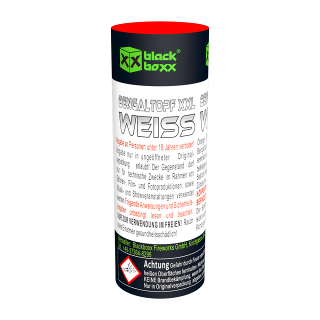 Weißer Bengaltopf mit intensiv leuchtender Farbe, minimaler Rauchentwicklung und einer ca. 50cm hohen Flamme.